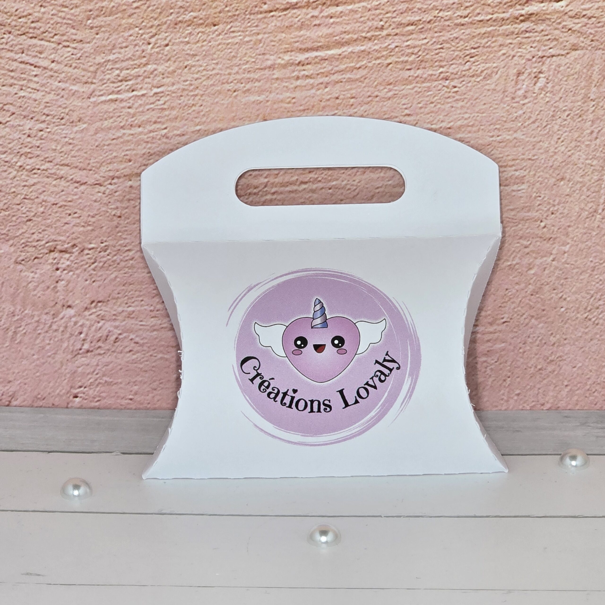 Petite pochette en forme de coussin avec une hanse où l’on peut y glisser des chocolats, des bonbons, des dragées…